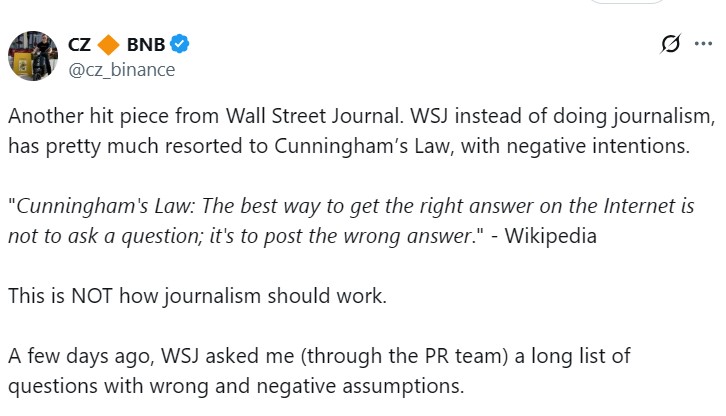 Чжао утверждает, что отчет WSJ является «атакой» на крипто