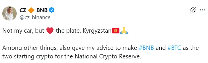 5 мая Чжао поделился с X, что он посоветовал Кыргызстану начать с Биткоин (BTC) и BNB (BNB) при создании своего национального резерва криптовалюты. В 2024 году Форбс заявил, что Чжао имеет около 94 миллионов токенов BNB, около 64% циркулирующего предложения BNB. На момент написания статьи эти токены стоят около 55 миллиардов долларов.