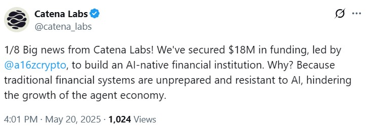 20 мая, Catena Labs, компания, создающая «AI-немолевое финансовое учреждение», объявила, что она получила 18 миллионов долларов в раунде финансирования во главе с Crypto Andreessen Horowitz (A16Z), криптовалютой A16Z и Web3 Venture Capital Arm.