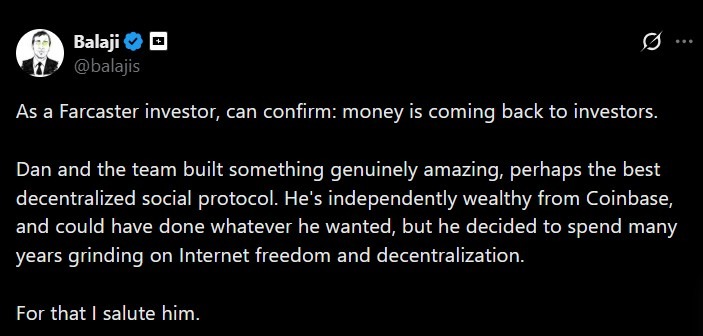 На публикацию отреагировал инвестор Farcaster Баладжи Шринивасан, который подтвердил, что средства инвесторов возвращаются. Он также высоко оценил работу команды над децентрализованной социальной инфраструктурой.