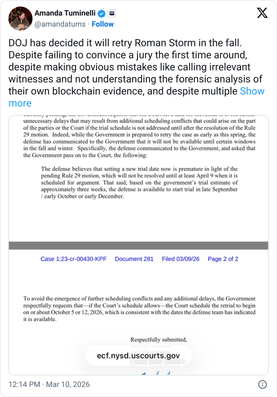 «Несмотря на то, что с первого раза не удалось убедить присяжных, несмотря на очевидные ошибки, такие как вызов не имеющих отношения к делу свидетелей и непонимание судебно-медицинского анализа собственных доказательств блокчейна, а также несмотря на многочисленные юридические и логические ошибки в их утверждениях об ответственности сторонних разработчиков, SDNY повторит попытку Романа Сторма», — добавила она.