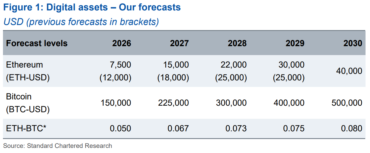 Согласно отчету, опубликованному в понедельник Cointelegraph, Standard Chartered снизил прогноз цены на эфир до 7500 долларов на конец 2026 года по сравнению с ранее прогнозируемыми 12 000 долларов, одновременно снизив прогноз на конец 2028 года с 25 000 до 22 000 долларов.