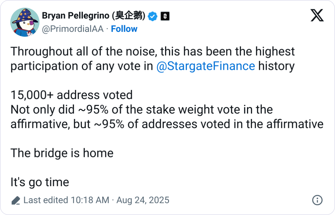Соучредитель и генеральный директор Layerzero Брайан Пеллегрино в воскресенье написал в воскресенье, что в голосовании сообщества Stargate было «высшее участие любого голоса» в истории платформы.