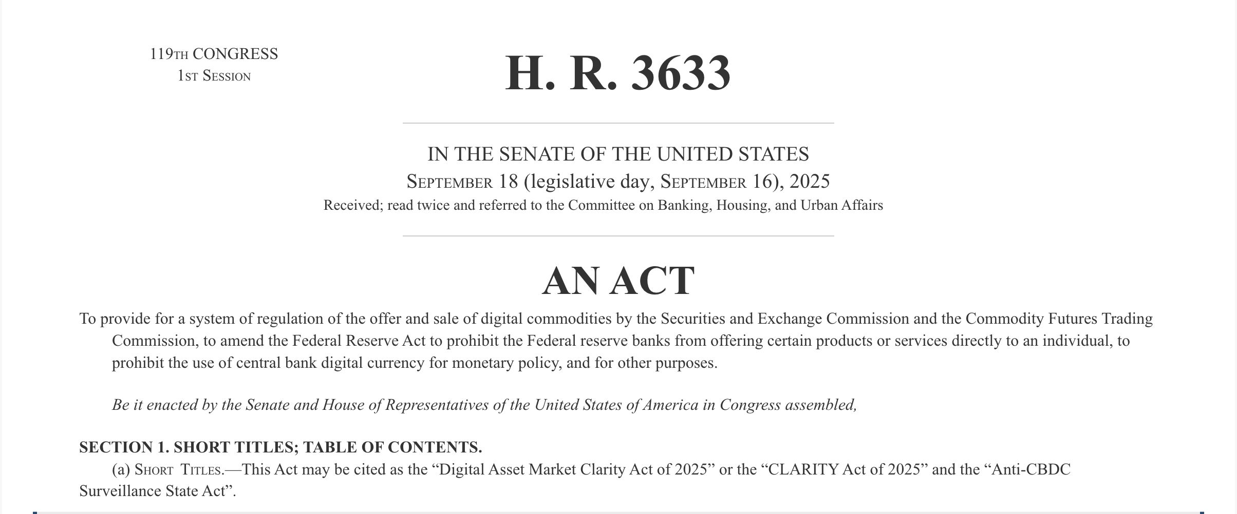 Закон о ясности рынка цифровых активов 2025 года, также известный как Закон CLARITY, представляет собой комплексную нормативную базу рынка криптовалют, которая устанавливает таксономию активов, регулирующую юрисдикцию и надзор за рынками криптовалют.
