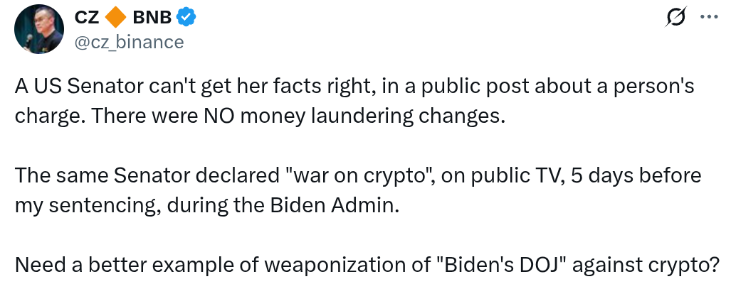 Соучредитель Binance Чанпэн «CZ» Чжао ответил на сенатора США Элизабет Уоррен после того, как она заявила, что он «признал себя виновным по уголовному обвинению в отмывании денег».