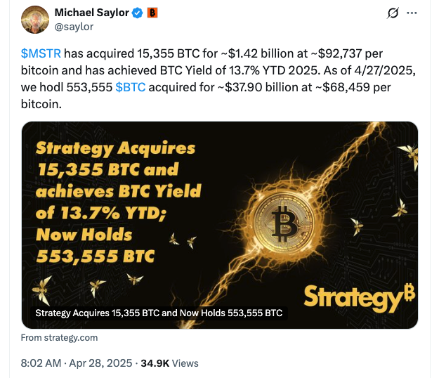 «По состоянию на 27 апреля мы приобрели 553 555 BTC примерно за 37,90 млрд. Долл. США до 68 459 долл. США за биткоин», – отметил Сайлор.