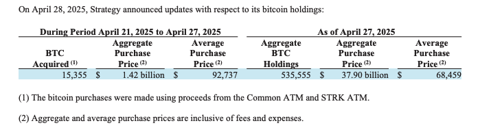 В объявлении 28 апреля стратегия сообщила о приобретении 15 355 Биткоин (BTC) в период с 21 по 27 апреля.