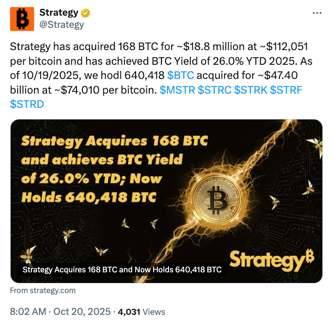Последняя покупка Биткоин последовала за покупкой 220 BTC за 27,2 миллиона долларов на предыдущей неделе, которая произошла, когда BTC ненадолго достиг нового рекордного максимума выше 126 000 долларов, а затем упал до 110 000 долларов в результате обвала рынка 10 октября.