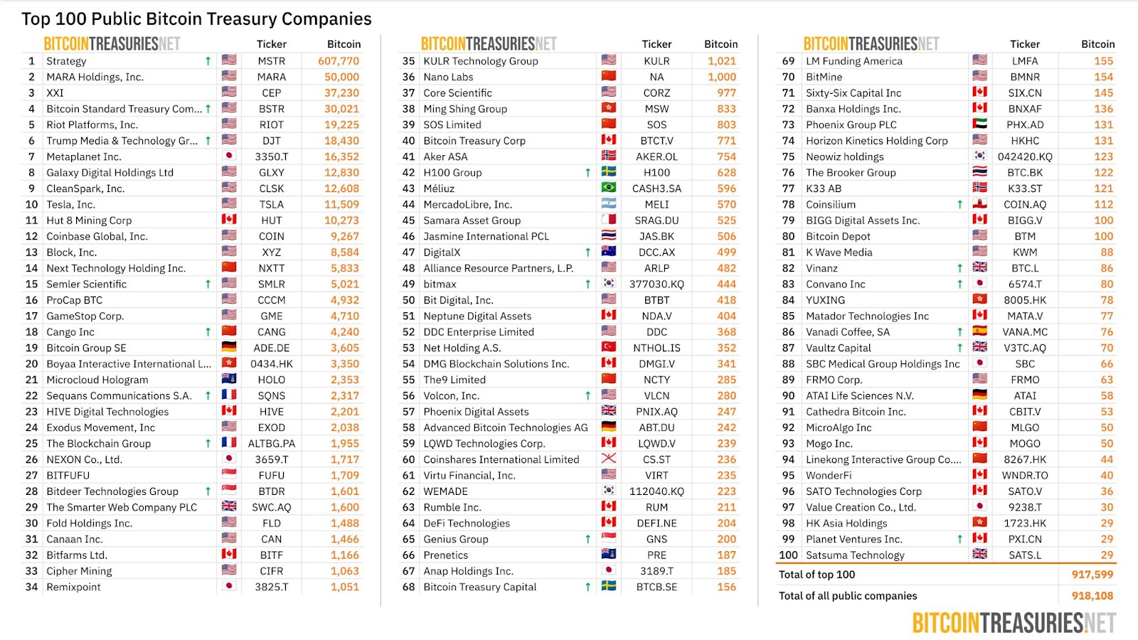 Согласно отраслевым данным, 100 лучших общедоступных биткоин -казначейских компаний в совокупности имеют 917 599 BTC. В общей сложности все публичные компании объединили собственные 918 108 BTC, а только стратегия составляет 66% от этого общего числа.