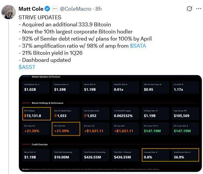 В настоящее время Strive входит в десятку крупнейших корпоративных казначейских компаний по биткоину после того, как ее покупка 333,9 Биткоин по средней цене 89 851 доллара увеличила ее общий объем до 13 132 BTC на сумму 1,17 миллиарда долларов.