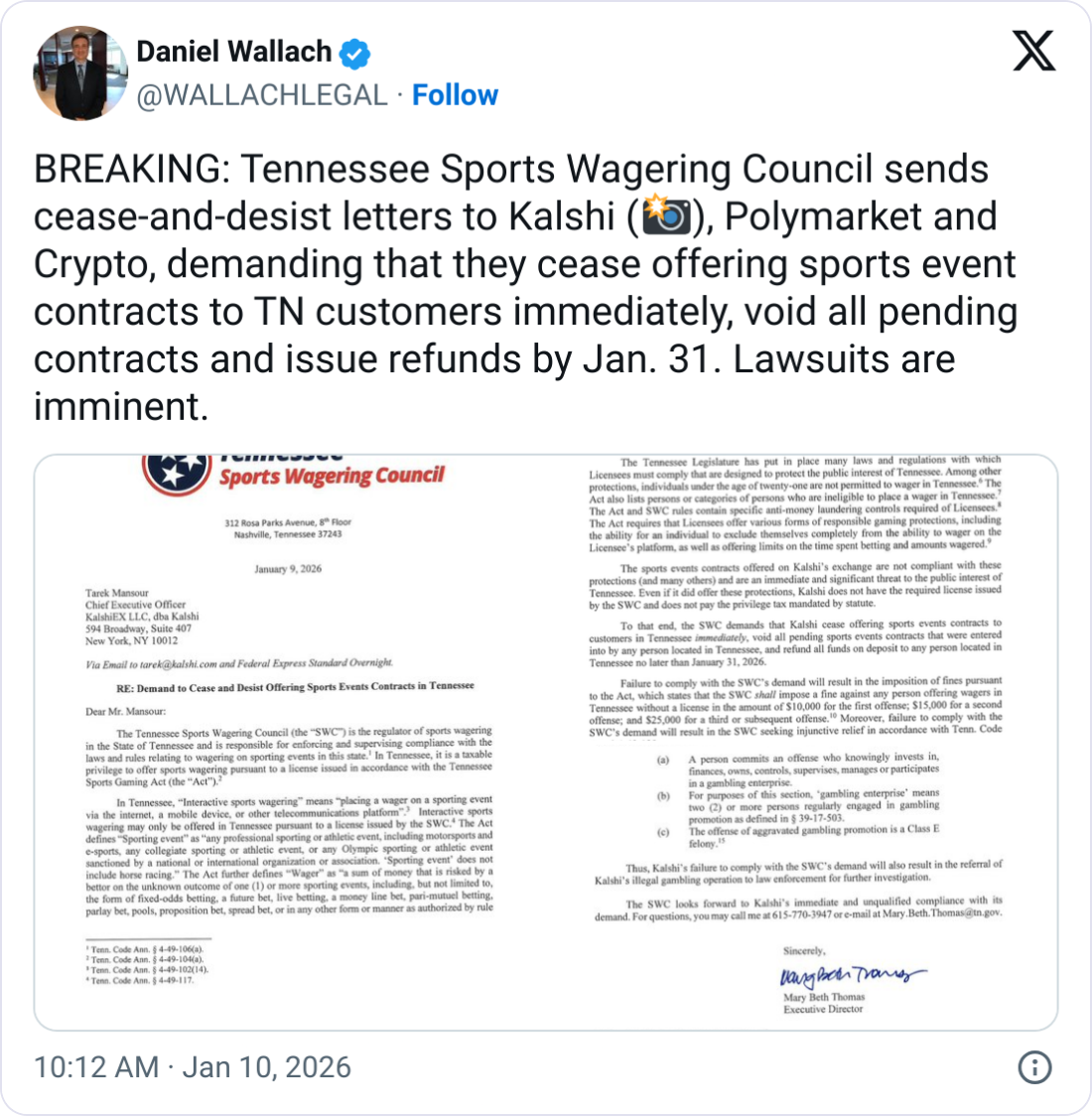 В пятницу Совет Теннесси по ставкам на спорт направил Калши, Polymarket и Crypto.com письма о прекращении противоправных действий, предписывая им прекратить предлагать контракты на спортивные мероприятия в штате.