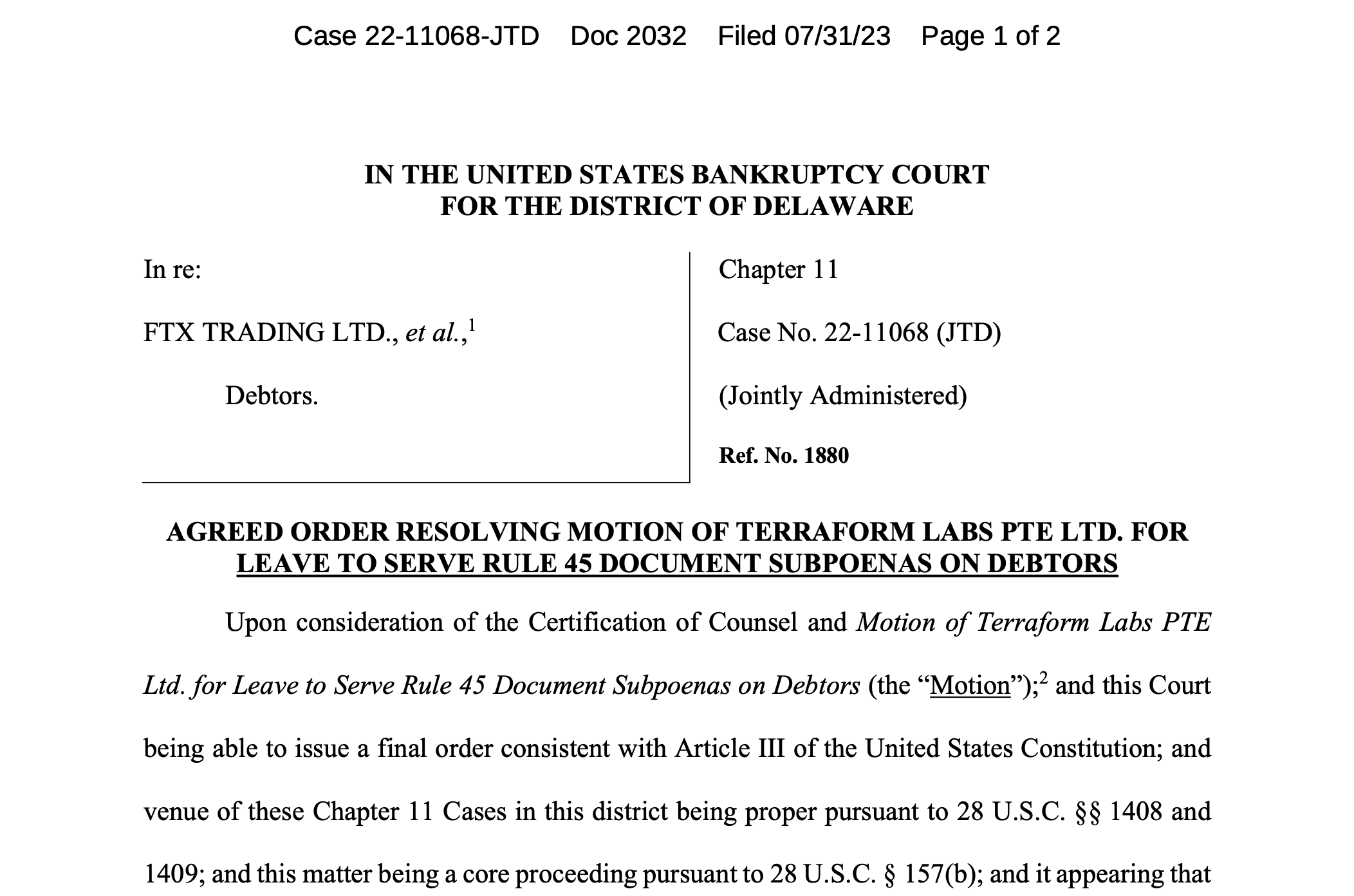 Судья по делу о банкротстве несуществующей криптовалютной биржи FTX издал распоряжение, позволяющее Terraform Labs вызывать в суд информацию, которая может быть использована в ее деле, поданном Комиссией по ценным бумагам и биржам США (SEC).