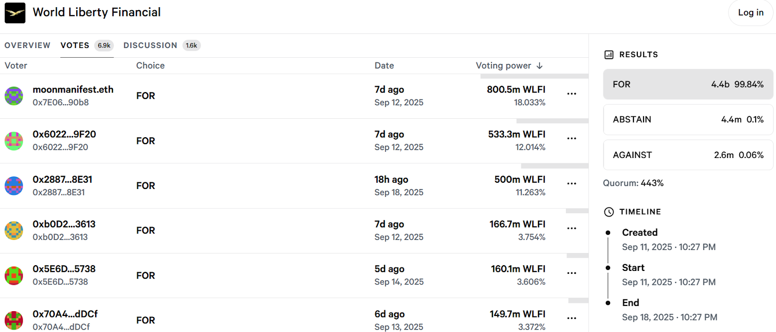 Голосование на управлении прошло почти через три недели после официального запуска токена WLFI 1 сентября, что привело к снижению цен на 40% в течение первых трех дней после ее запуска, что привело к миллионам долларов убытков для китов, сообщил Cointelegraph 4 сентября.