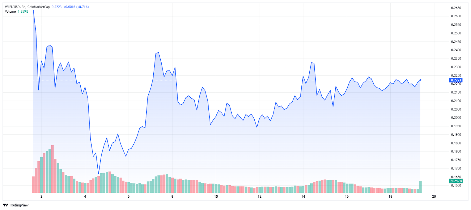 Данные CoinmarketCap показывают, что токен WLFI снизился более чем на 28% с момента запуска и торгуется на уровне 0,2223 долл. США на момент написания.