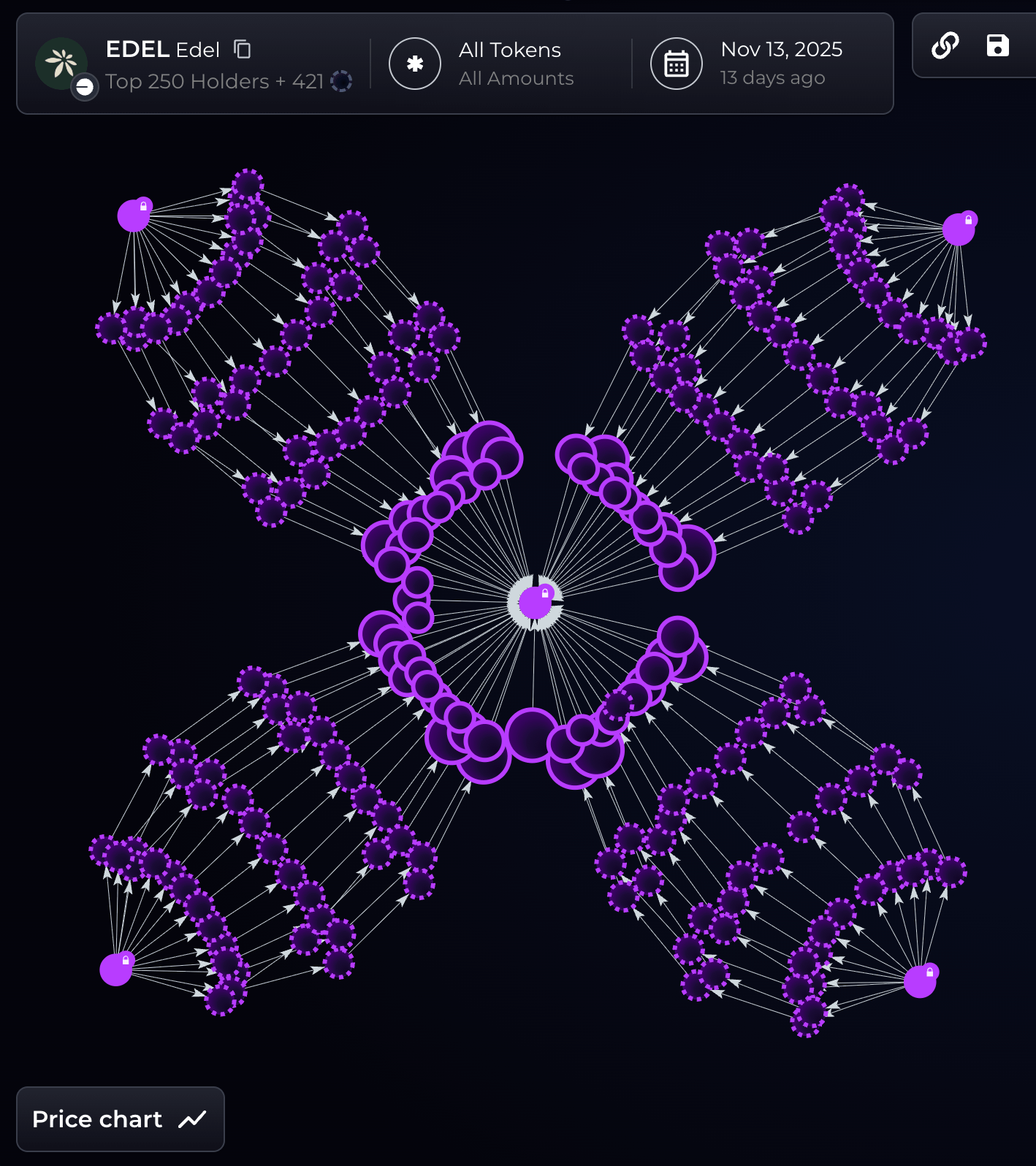 Аналитическая платформа блокчейна Bubblemaps заявила в сообщении во вторник X, что кластер из примерно 160 кошельков накопил около 30% запаса токенов EDEL на сумму около 11 миллионов долларов во время запуска в начале этого месяца. Платформа утверждала, что кошельки были связаны и финансировались скоординированно непосредственно перед открытием торгов.