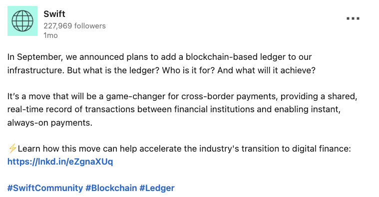 SWIFT объявила о планах «добавить реестр на основе блокчейна в свой стек инфраструктуры» в сентябре 2025 года.