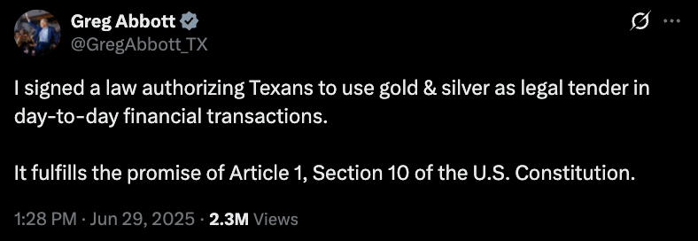 В воскресенье X Post губернатор Техас Грег Эбботт объявил, что подписал законопроект о доме 1056 после прохождения в Государственной палате представителей и сената. Законопроект, который, как ожидается, вступит в силу 1 мая 2027 года, вносит изменения в Кодекс правительства штата, чтобы распознать золото и серебро в качестве законного платежника и для жителей, чтобы использовать их в повседневных транзакциях на основе определенного значения контролера в то время.