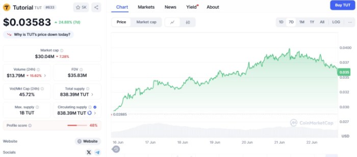 $Tut был в сенсационном заезде в последнее время, набрав более 25% за последние 7 дней. В настоящее время он торгуется на уровне 0,03583 долл. США, предлагая скидную точку входа, прежде чем взрываться, чтобы имитировать рост крипто.