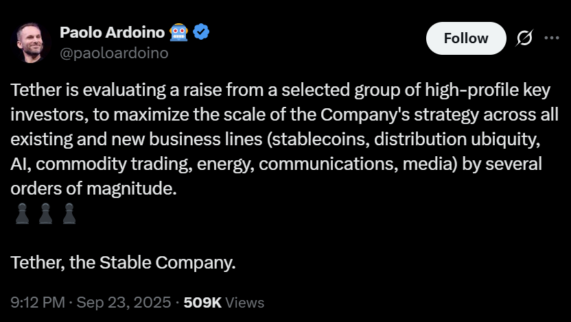 Как недавно сообщил Cointelegraph, компания стремится привлечь 20 миллиардов долларов при оценке в 500 миллиардов долларов. Хотя генеральный директор Паоло Ардоино не подтвердил конкретных цифр, он заявил, что компания привлекает капитал «от избранной группы высокопоставленных инвесторов», продолжая расширять направления своего бизнеса.