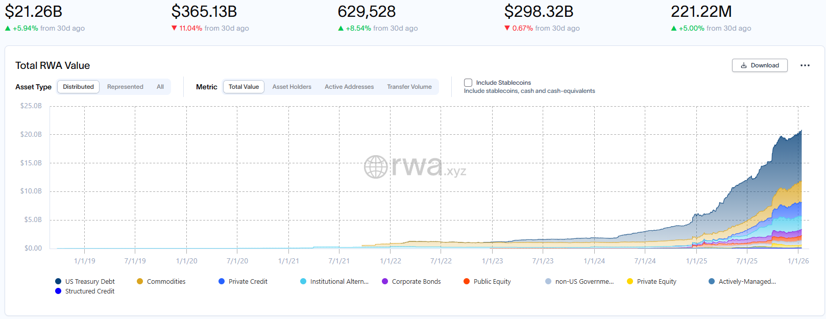 По данным RWA.xyz, по состоянию на четверг в сети RWA находится более 21 миллиарда долларов США среди более чем 629 528 держателей.