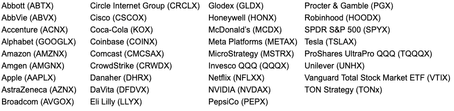 В начальном развертывании будут представлены 35 токенизированных акций, включая Circle (CRCLX), Coinbase (Coinx), Robinhood (Hoodx) и TON Strategy (Tonx).