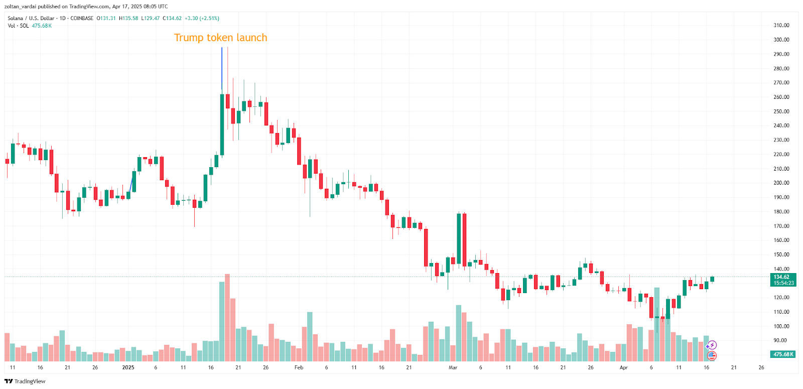Сол упал примерно на 48% за последние три месяца с момента инаугурации Трампа, когда он кратко достиг 270 долларов, показывают данные Tradingview.