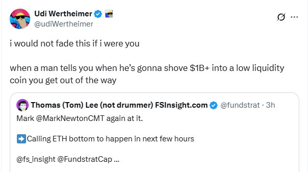 Во вторник во вторник управляющий партнер Fundstrat Global Advisors Том Ли поднял эфир на рынке криптовалют, так как его казначейская фирма Eth Bitmine купила еще 21 миллион долларов на эфир.