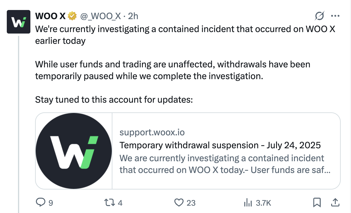 Платформа торговли криптовалютой WOO X приостановила услуги по снятию средств после того, как нарушение кибербезопасности повлияло на несколько счетов, что привело к убыткам в 14 миллионов долларов.