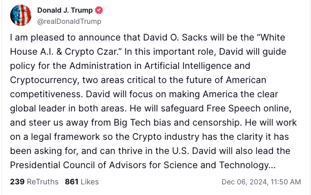 «Дэвид О. Сакс станет «царем искусственного интеллекта и криптовалют Белого дома», — написал Трамп в сообщении от 6 декабря на своей платформе социальных сетей Truth Social. Он добавил, что Сакс также возглавит «Президентский совет советников по науке и технологиям».