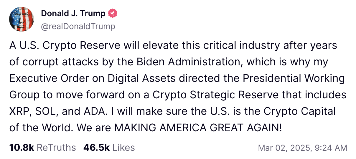 Президент часто использует свою платформу в социальных сетях, чтобы предложить политику перед каким -либо официальным объявлением через Белый дом. Трамп подписал исполнительный приказ для создания «цифрового актива» 6 марта – примерно через четыре дня после поста, который все еще жил во время публикации.