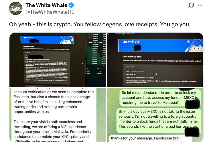 Псевдонимный трейдер решил увеличить средства вскоре после того, как он утверждал, что Mexc попросил, чтобы он полетел в Малайзию, чтобы доказать свою личность лично, чтобы его средства освободили свои средства.