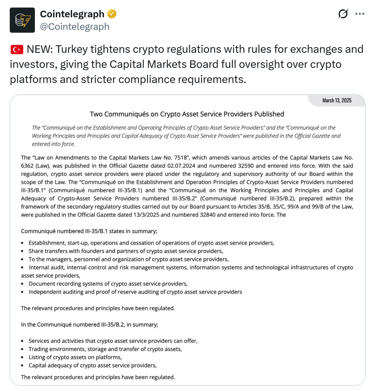 В марте Совет по рынкам капитала Турции (CMB) ввел лицензионные и эксплуатационные правила для CASPS. Структура предоставляет полную власть CMB из -за обменов криптовалюты, поставщиков кошелька и хранителей, согласуясь на национальный надзор с глобальными нормативными стандартами.