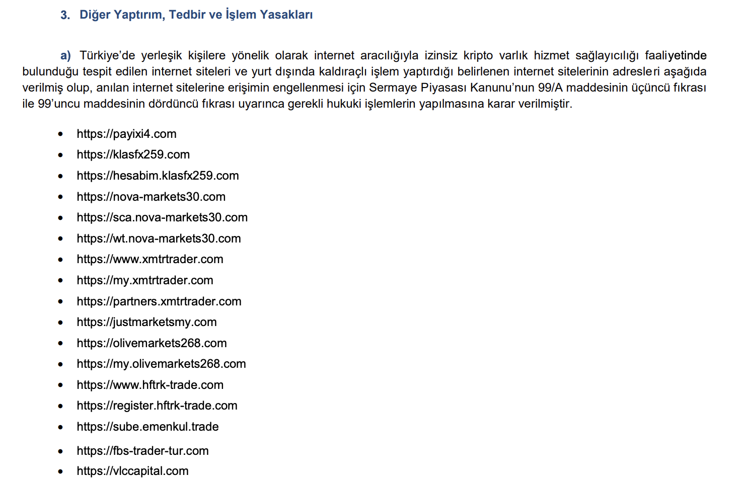 Совет по рынкам капитала Турции, финансовый регулятор страны, объявил, что заблокировал доступ к веб -сайтам, «предоставляющим несанкционированные услуги по криптовалютному активам».