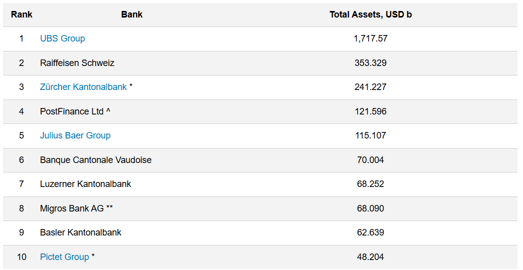 По данным Advratings, UBS Group является крупнейшим швейцарским банком с совокупными активами в $1,7 трлн, за ним следуют Raiffeisen Schweiz с $353 млрд, Zürcher Kantonalbank с $241 млрд и PostFinance с $121 млрд.
