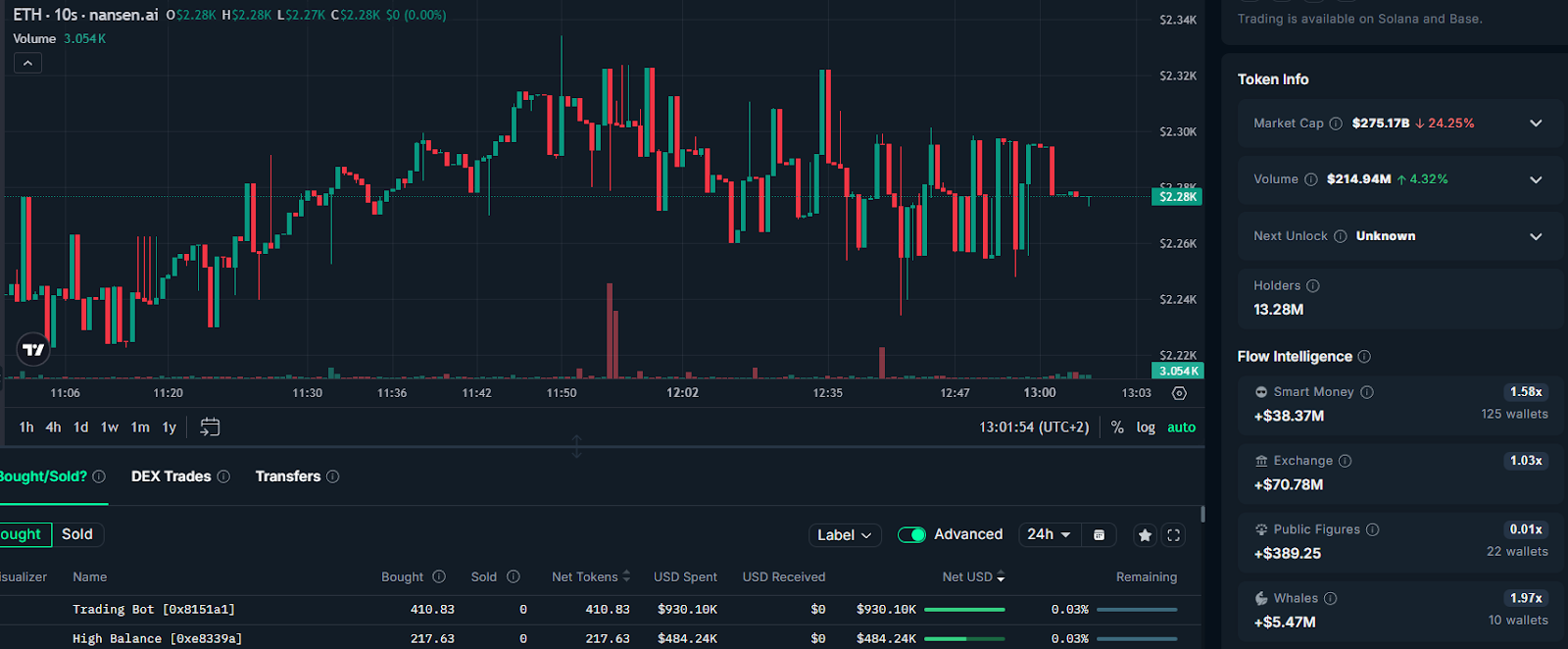 По данным платформы анализа криптовалют Nansen, за прошедшую неделю умные трейдеры приобрели спотовые токены ETH на сумму 38,3 миллиона долларов, в то время как киты приобрели 5,47 миллиона долларов, а новые кошельки купили 31 миллион долларов.