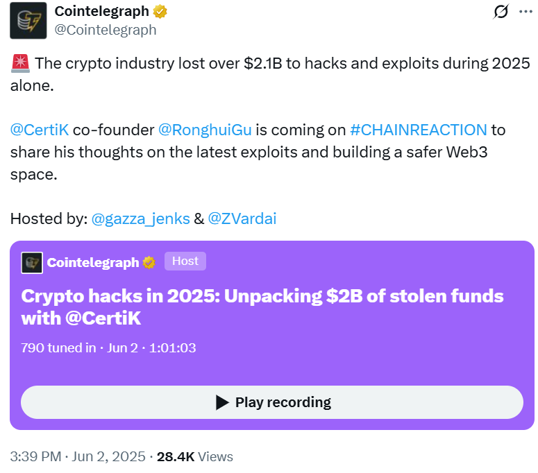 Certik спостерігав зміну моделей атаки з розумних контрактів та вразливості інфраструктури блокчейн для використання лазів у поведінці людини, сказав Гу, який Cointelegraph під час ланцюгової реакції щодня показує X простори, додаючи: додавши: