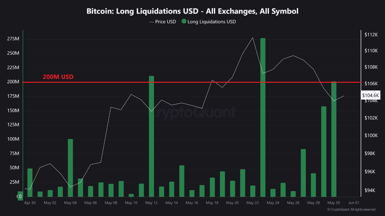 У швидкій публікації на криптохит-платформі, аналітик з ланцюгом Бурак Кесмесі поділився, що ринок біткойна став свідком своєї третьої за величиною тривалої ліквідації в травні. Дані Cryptoquant показують, що 202 мільйони доларів на довгих позиціях BTC були ліквідовані на біржі деривативів Binance у п’ятницю, 30 травня.