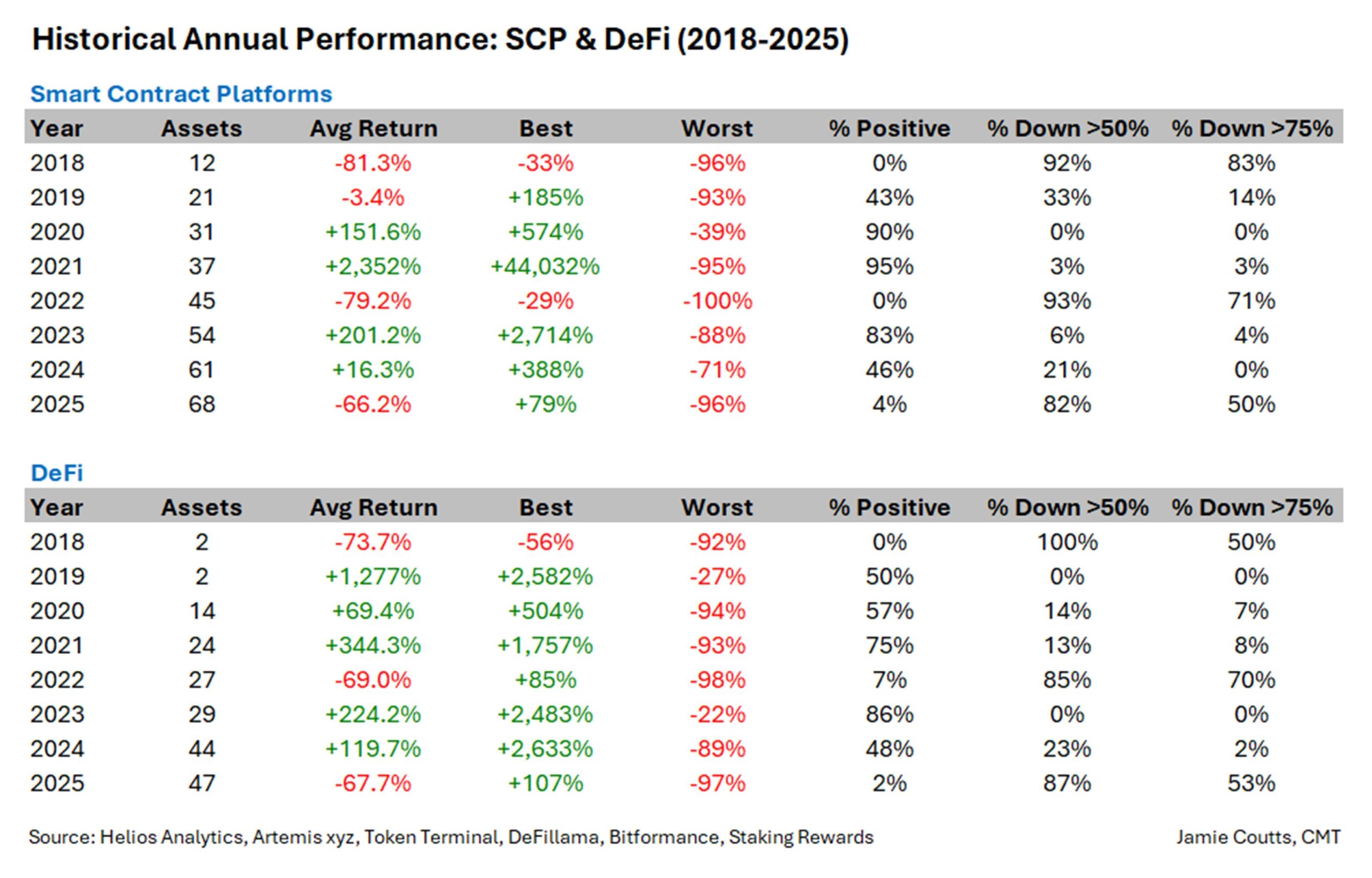 За винятком біткойнів (BTC), 2025 рік виявився ведмежим ринком для ширшого ринку криптовалют. Токени децентралізованого фінансування (DeFi) впали на 67%, тоді як криптовалюти, пов’язані з блокчейнами смарт-контрактів, дали від’ємну середню прибутковість у 66%, згідно з даними про блокчейни, наданими Джеймі Коуттсом, головним криптовалютним аналітиком Real Vision.