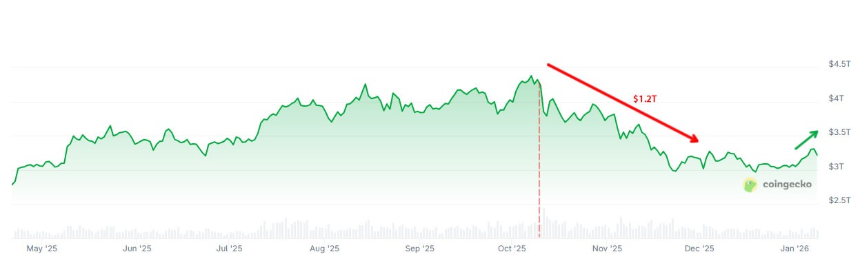 Після обвалу 10 жовтня ринки криптовалют втратили понад 1,2 трильйона доларів, але в січні показали ознаки відновлення. Джерело: Coingecko