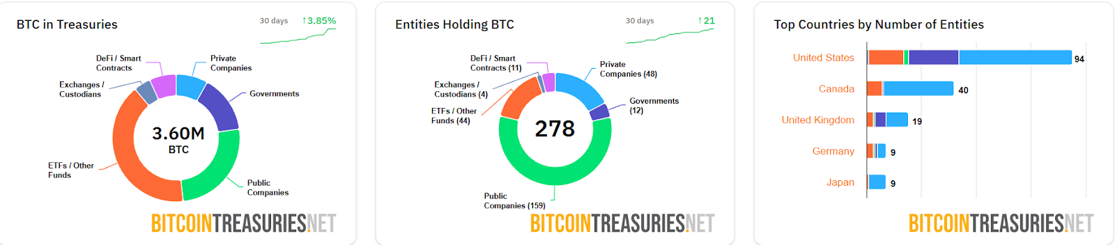 Слідом за новою хвилею інституційної покупки, зараз понад 278 державних організацій проводять біткойн, що перевищує 124 кілька тижнів тому, повідомляє BitcoinTreasuries.net.
