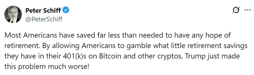 Не всі у фінансовому світі вітали цю новину. Адвокат золота та критик криптовалют Пітер Шифф попередив, що ця нова розробка може погіршити те, що він вважає жахливим розривом на пенсію в США.
