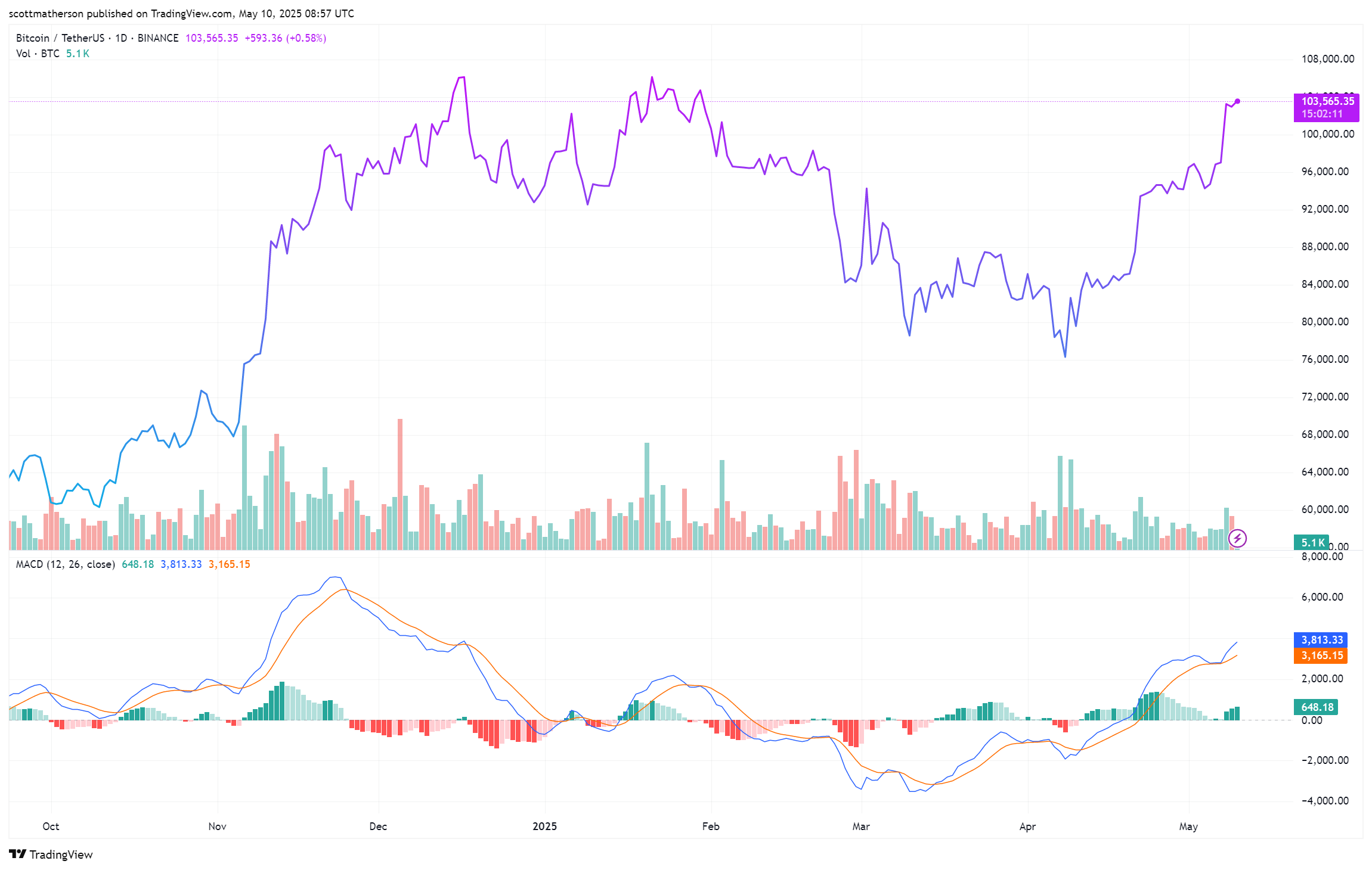 BTC Trading на рівні 103 580 доларів на 1D -діаграмі |Джерело: BTCUSDT на TradingView.com