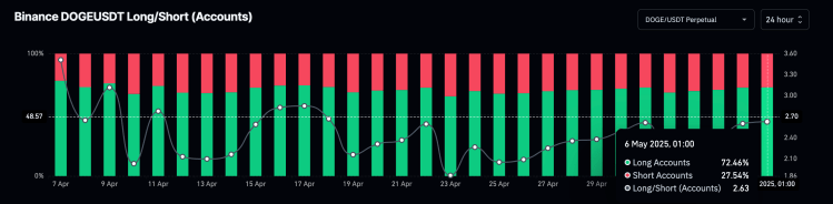 В даний час з усіх відкритих ставок на Dogecoin на обмін криптовалют Binance, 72,46% на момент цього написання довгі. Це залишає лише менший відсоток – 27,54% торговців, які мають короткі. З цього приводу це показує, що бривокість зростає для монети мем.
