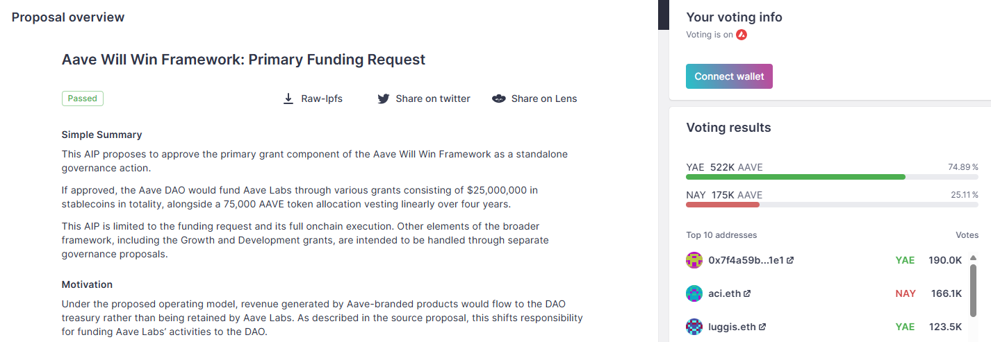 Фреймворк Aave Will Win пройшов температурну перевірку 1 березня, і незабаром після цього головний делегат управління, Aave Chan Initiative, оголосив, що припиняє свою участь у DAO через занепокоєння щодо стандартів управління та динаміки голосування під час процесу пропозиції.