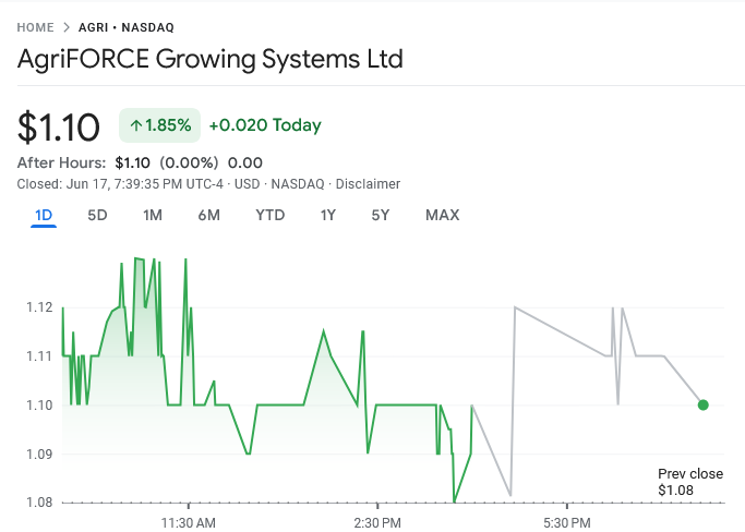 Акції в Agriforce (Agri) у вівторок зросли на 1,85% і закінчили торгову сесію на рівні 1,10 долара. Однак акції Agriforce знизилися на більш ніж на 53% на сьогоднішній день, повідомляє Google Finance.