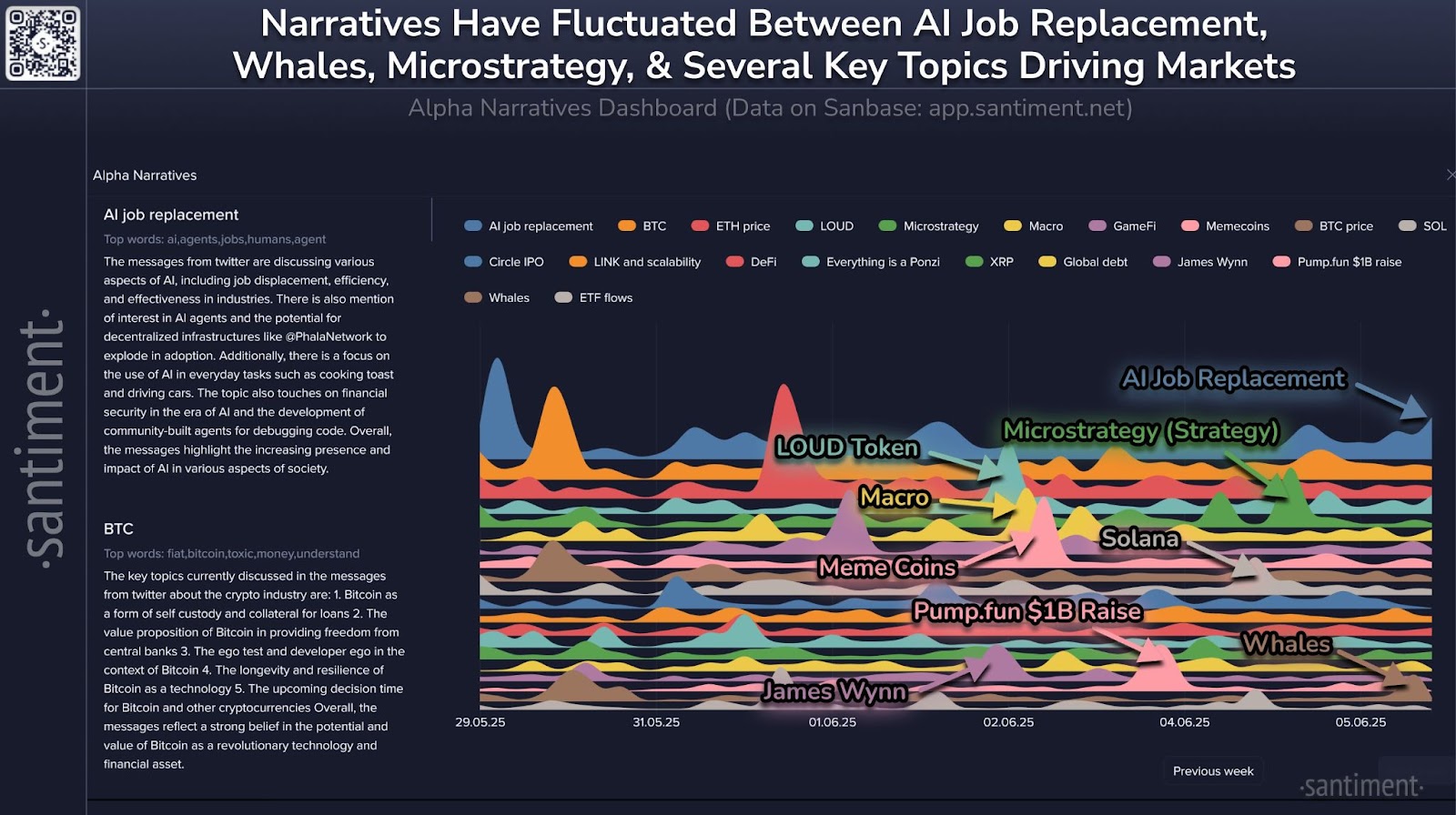 Альфа -розповіді Santiment Dashboard, знайдені на різних каналах соціальних медіа, таких як X, між 29 травня та 5 червня, користувачі обговорювали різні аспекти ШІ, включаючи переміщення робочих місць, ефективність та ефективність у галузях промисловості, більше, ніж криптовалюти, в дописі 9 червня на X.