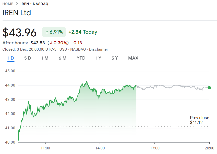 IREN (IREN) підскочив на 7,6% до піку в 44,25 долара під час торгів у середу, і встановився до 43,96 долара до дня дзвінка при прирості на 6,9%. Це сталося після того, як IREN впав більш ніж на 15% у вівторок після оголошення про плани залучення капіталу.