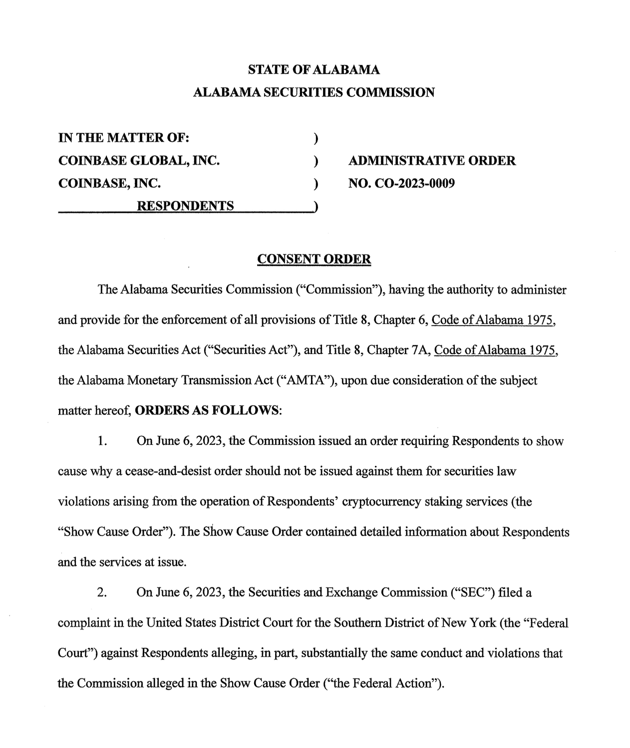 Комісія з цінних паперів в Алабамі подала свій позов проти Coinbase у червні 2023 року, поряд з державними регуляторами з Каліфорнії, Іллінойсу, Кентуккі, Меріленда, Нью -Джерсі, Південної Кароліни, Вермонта, Вашингтона та Вісконсіна.