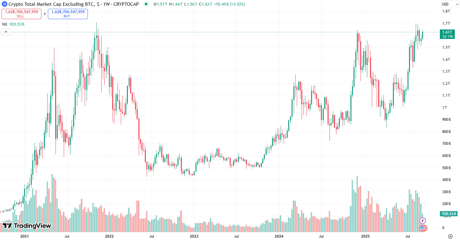 Загальна сума ринку Altcoin, що виключає Bitcoin та StableCoins, наразі становить 1,63 трлн дол. Попередній пік становив 1,64 трлн доларів у листопаді 2024 року, а до цього – 1,7 трлн доларів у листопаді 2021 року.