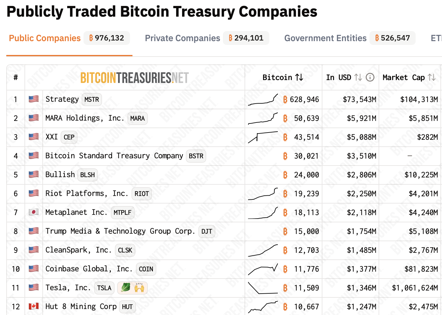 За даними BitcoInTreasuries.net, компанії, що публічно торгуються, мають 976,132 біткойн вартістю приблизно 114,6 мільярда доларів, тоді як акції приватних компаній становлять 294101 монети на суму 34,5 мільярда доларів при цьому написанні.